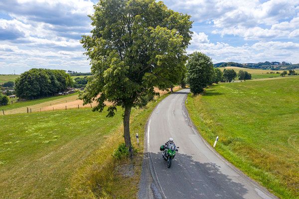 Gut gestärkt wartet bereits ein weiteres hessisches Motorrad-Highlight: der Burgwald. Dieser liefert auf einsamen Strecken bestes Material für Bike und Biker. Mit Rauschenberg wird dann der riesige Firmensitz des Zubehörherstellers SW-Motech erreicht, der einmal jährlich mit dem „Open House“ eine Riesenparty abbrennt.