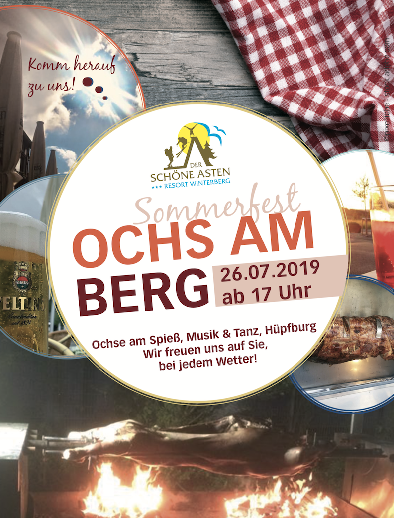 Willkommen im Sauerland, bei uns ist immer was los! Am 26.07.2019 ist es wieder soweit: Das Team vom Hotel-Resort "Der schöne Asten" in Winterberg schmeißt einen ganzen Ochsen auf den Grill. Aber das ist noch längst nicht alles: Wir packen noch Musik, Tanz und eine Hüpfburg für die Kinder dazu und machen uns einen tollen Nachmittag und Abend! Der Spielmannszug Altastenberg kommt auch vorbei. Herzlich Willkommen! Sommerfest "Ochs am Berg" Datum: 26.07.2019 Uhrzeit: Ab 17 Uhr Das Sommerfest...